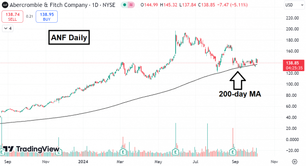 ANF впервые подступает к своей 200-дневной скользящей средней после падения более чем на 140% за последний год. 200-дневная скользящая средняя — это технический индикатор, который отражает среднюю цену акции за последние 200 торговых дней. Он используется для определения долгосрочных трендов: если цена акции находится выше этой линии, это указывает на восходящий тренд, если ниже — на нисходящий.