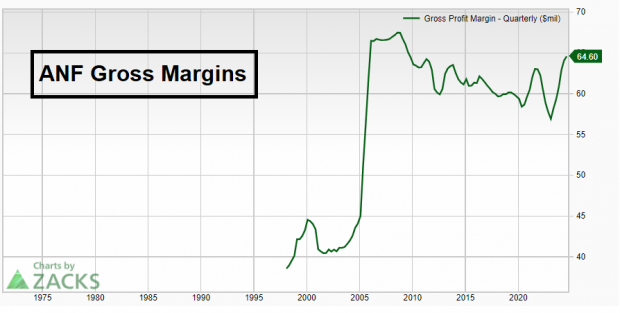 Маржа ANF увеличится в 2024 году после многолетнего нисходящего тренда. Валовая маржа Abercrombie увеличилась на 240 базисных пунктов до 64,9% во втором квартале и является одной из самых высоких в отрасли.