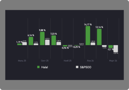 Март прошел на фоне жесткой рыночной коррекции, что отразилось на общей динамике портфеля. Smart Halal завершил месяц с результатом -2,10%, тогда как S&P 500 снизился на -5,25%.